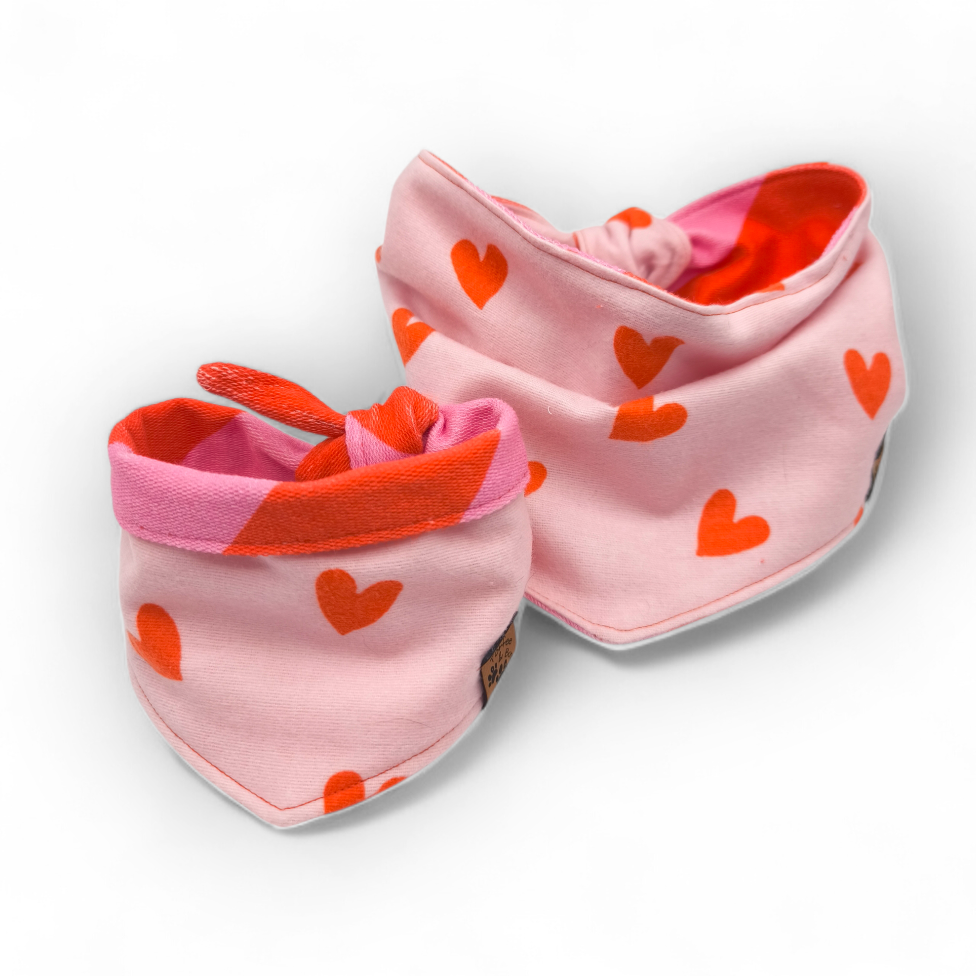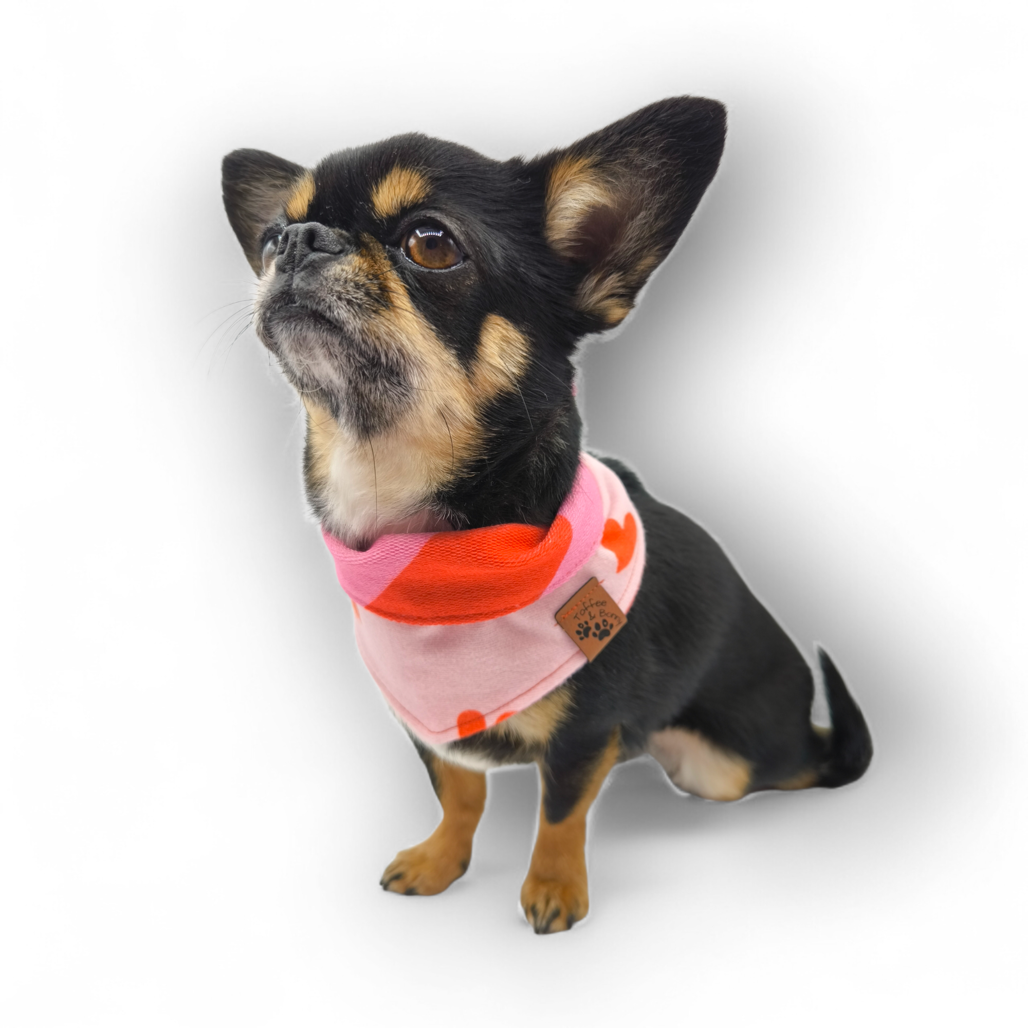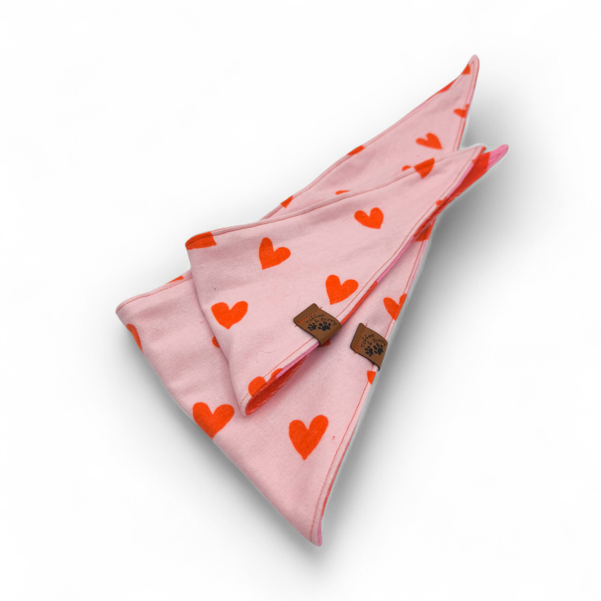 Dieses liebevoll gefertigte Hundehalstuch zum Knoten ist ein echter Hingucker für deinen Vierbeiner. Die Außenseite besteht aus besonders weichem Flanellstoff mit süßem Herzmuster, während die Innenseite aus angenehmem Sommersweat in Rot-Rosa gestreift gefertigt ist. Dadurch ist das Halstuch nicht nur stylisch, sondern auch angenehm zu tragen – ideal für jede Jahreszeit.