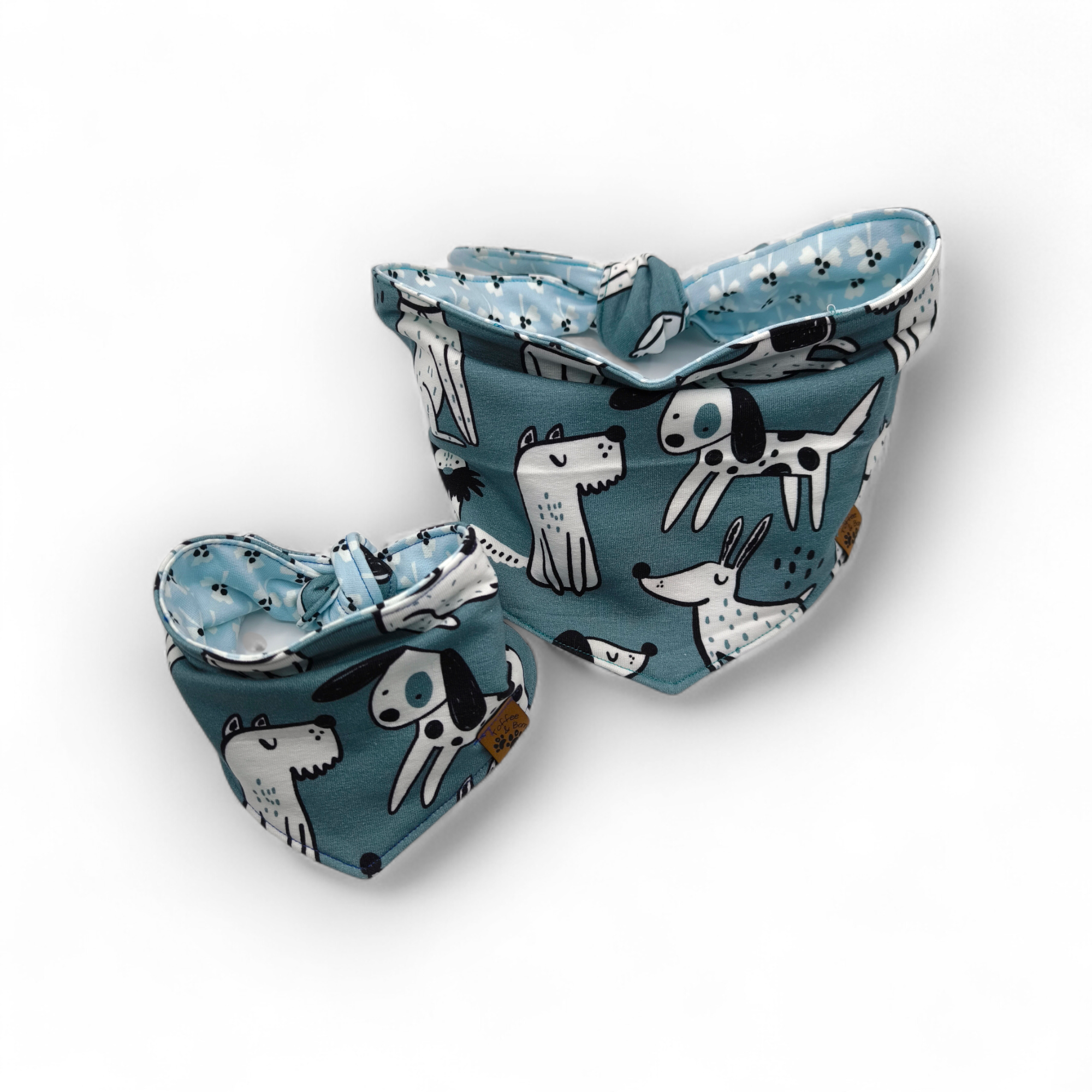Die Außenseite begeistert mit einem süßen Hundemuster, während die Innenseite mit weißen Blumen auf blauem Hintergrund einen frischen, sommerlichen Kontrast setzt. Durch das Wendedesign kann das Halstuch je nach Lust und Laune getragen werden.
