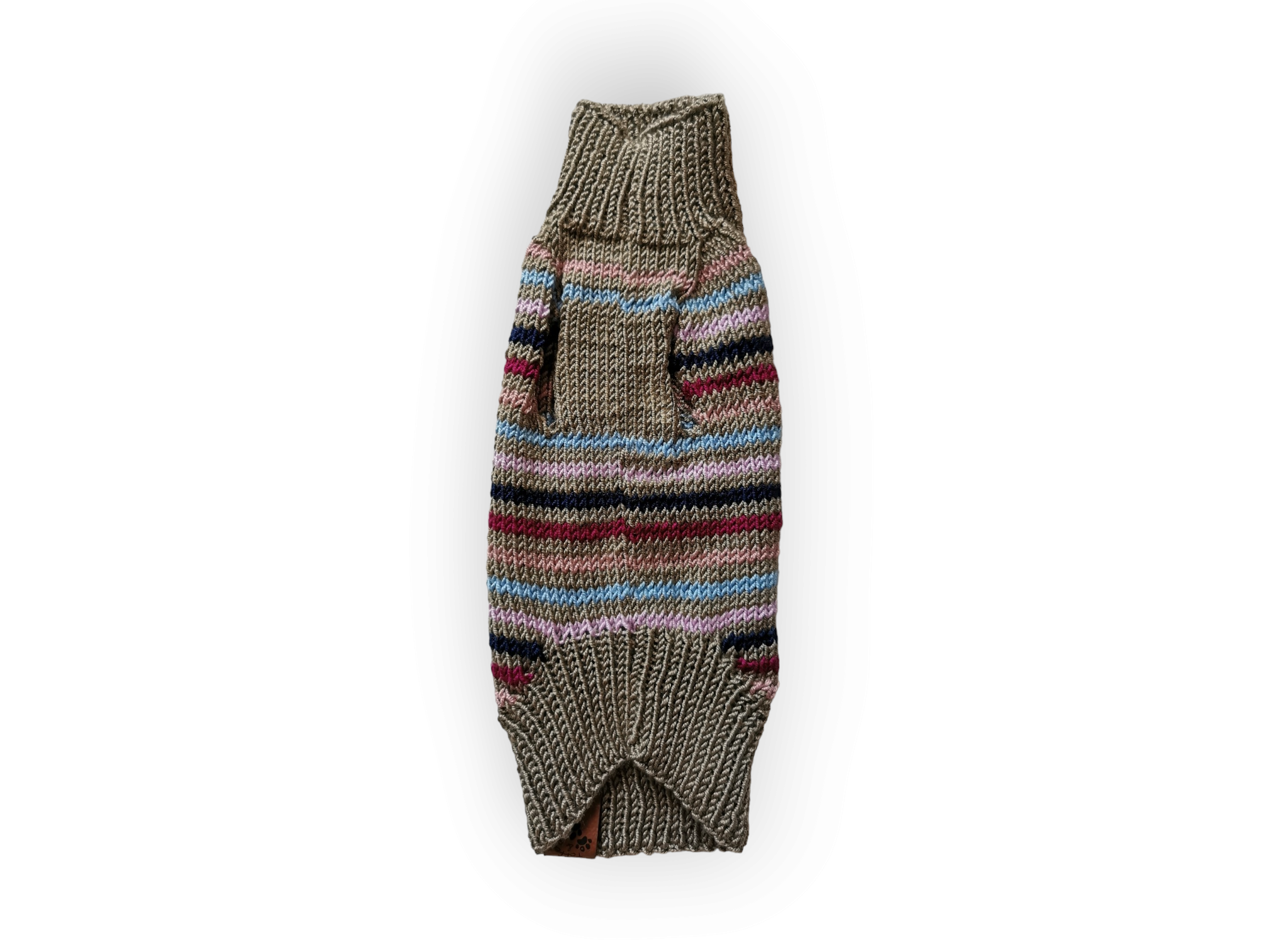 Hochwertiger Hundepullover aus extra leichter Acrylwolle in einem zarten Ringel-Muster auf dem Rücken, abgerundet mit einem Bündchen Sand.